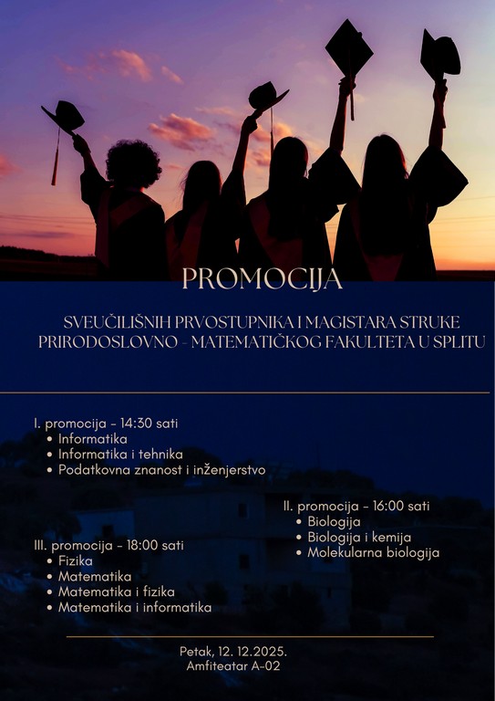 U petak, 12. prosinca 2025. godine u Amfiteatru A-02 održat će se svečane promocije sveučilišnih prvostupnika i sveučilišnih magistara struke koji su diplomirali na Prirodoslovno – matematičkom fakultetu u Splitu prema sljedećem rasporedu