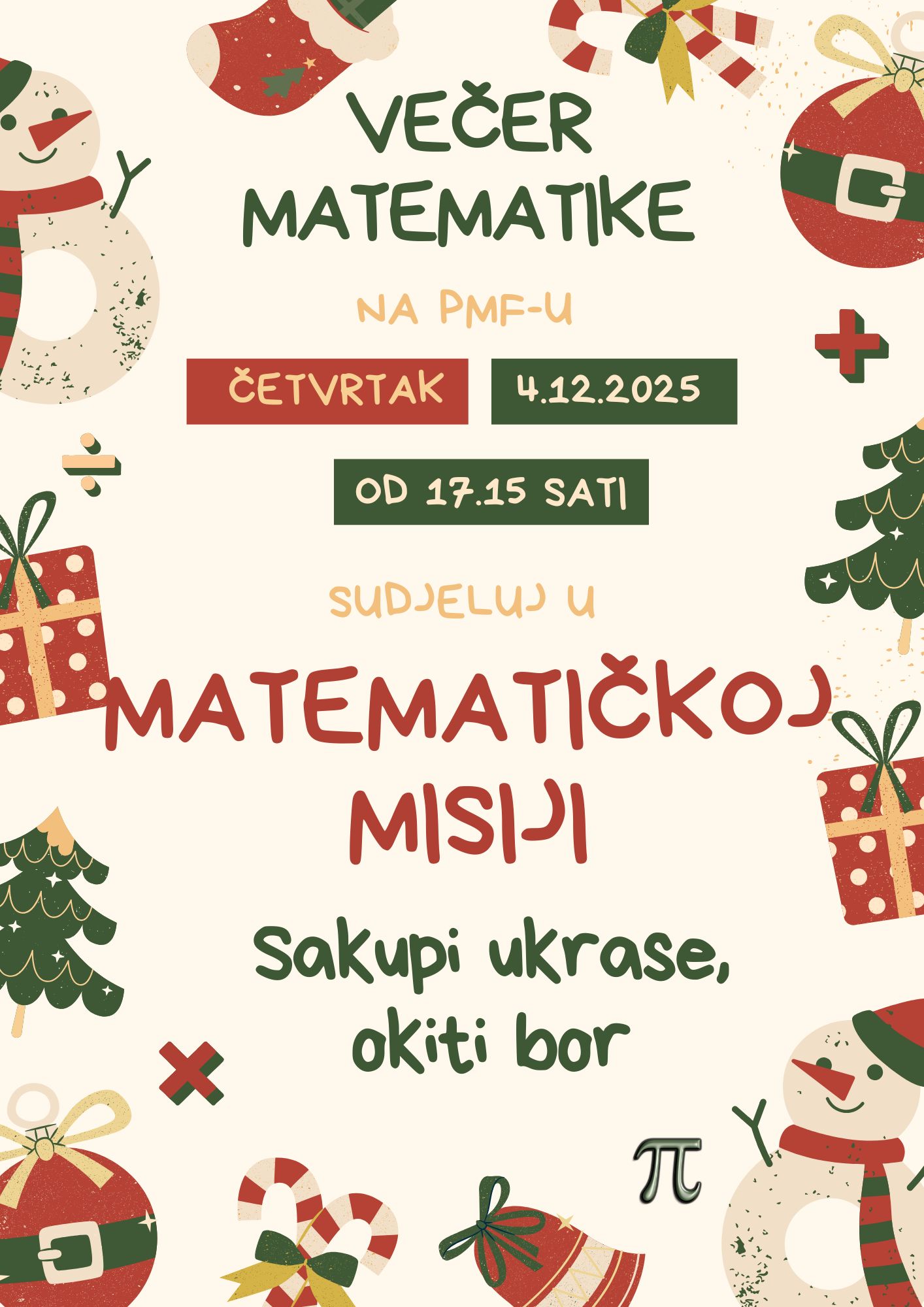 Pozivamo učenike 5.-8. razreda osnovne škole i srednje škole, te sve drage kolegice i kolege na sudjelovanje u 13. Večeri matematike, koja će se održati u četvrtak, 4. prosinca 2025., na Odjelu za matematiku PMF-a u Splitu.